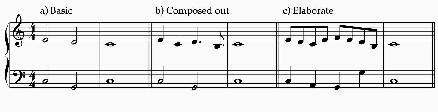 With that said, the foundation of Schenkerian Analysis is the claim that a piece of tonal music is an elaboration on a fundamental background structure. You know how when a singer riffs around a melody but (if they do it well) it’s still the same melody you know? The contention essentially takes that and puts it to the extreme. The melody itself is a riff (or to be more precise a “composing-out”) of some more fundamental background. As some levels of analysis, this is trivially true. Take the following example of how a simple melody can be expanded through passing notes and other added notes, while still retaining its core identity.