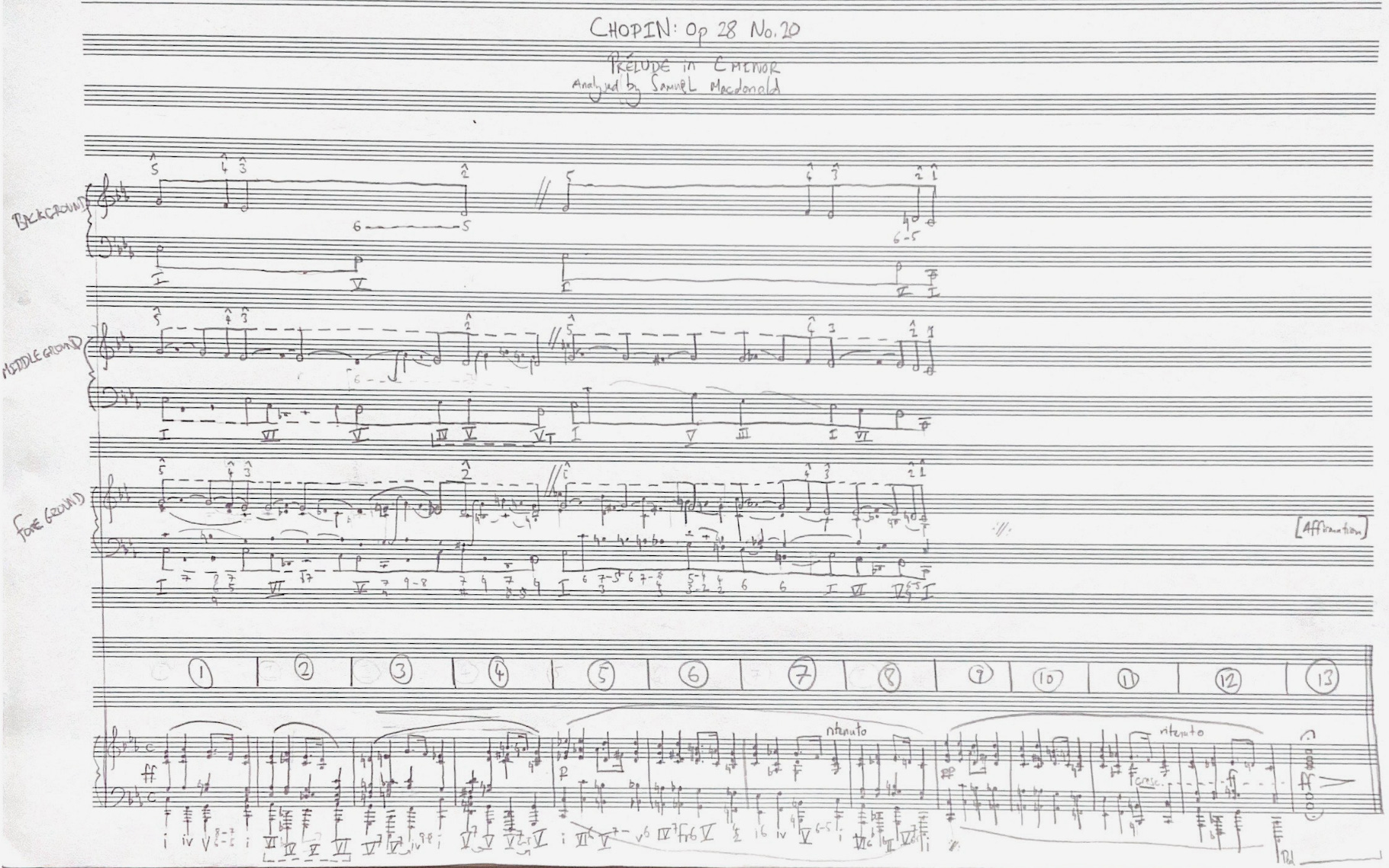 Next we have the middleground, where we start to see auxiliary notes. Both the obvious ones, like the A♭ in bar 1, and the less obvious ones. In particular there is a contentious choice of which tones are structural and which are auxiliary over the structural V. The line at the middleground level goes ^3-^2-^3-^2. The question is: do we remain in structural ^3 and the first ^2 is an auxiliary note, or do we go into structural ^2 and the second ^3 is a auxiliary to that? There are a couple of reasons why I opted for the former. The main one is that at this structural level, moving from ^3-^2 would make a parallel fifth with the VI-V in the bass. Subjectively, too, the ^2 sounds like it has an upwards momentum, especially with the ^♯3 that follows it. It is interesting the impact that this reading has on an ambiguity in the sources for this prelude. A significant Dover edition, and one of Chopins autograph scores has an E♮ on beat 4 of bar 3 (or rather the note has no accidental, which means it takes on the E♮ from earlier in the bar), but other Chopin autographs make it a clear E♭. The clincher for me is that there are a few sources where Chopin has written in the ♭ into a pupil’s book, but even so, some (especially older) performances go for the E♮. My reading here relies on the E♭, so it is important!