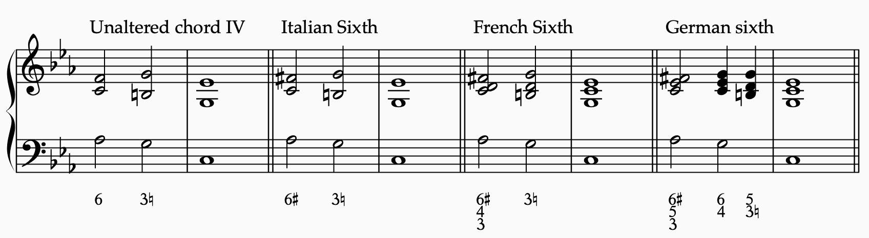Back in J.S. Bach’s day, a first inversion chord was notated with the number 6, because that is the interval between the lowest sounding note and the root note of the chord. In a minor key, that will be a major sixth. At some point, composers discovered that you can intensify this movement by raising the root note of the chord, in turn “augmenting” the size of this interval to the titular augmented sixth, which then resolves outwards by semitone to an octave on chord V.